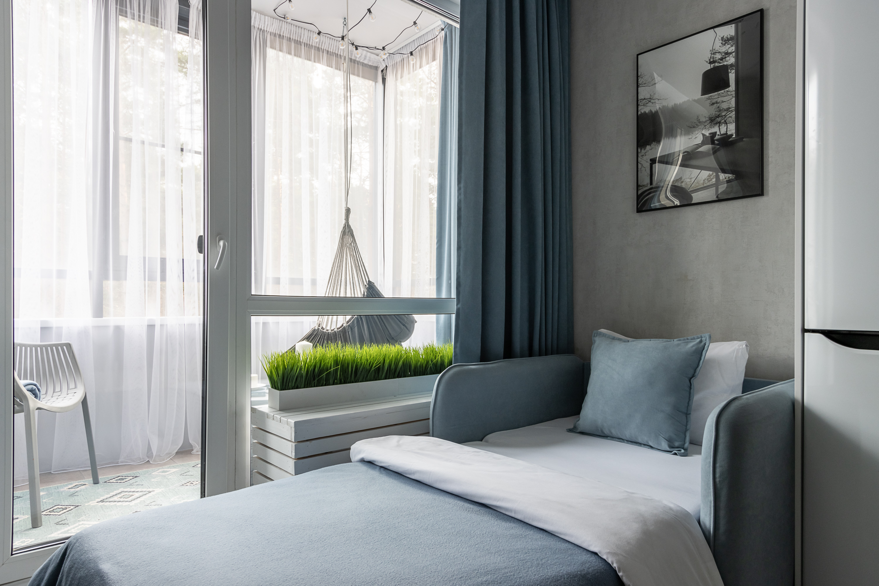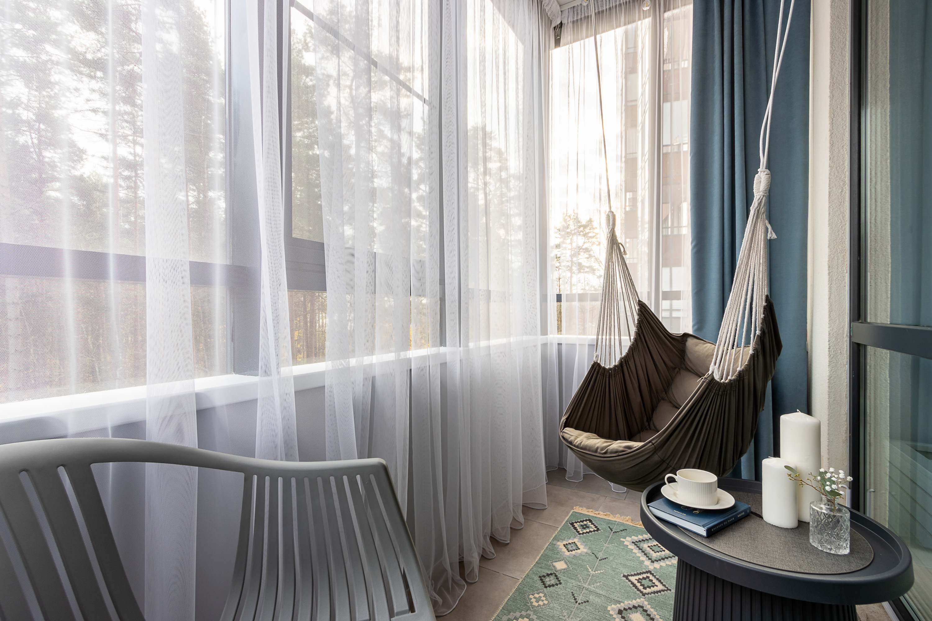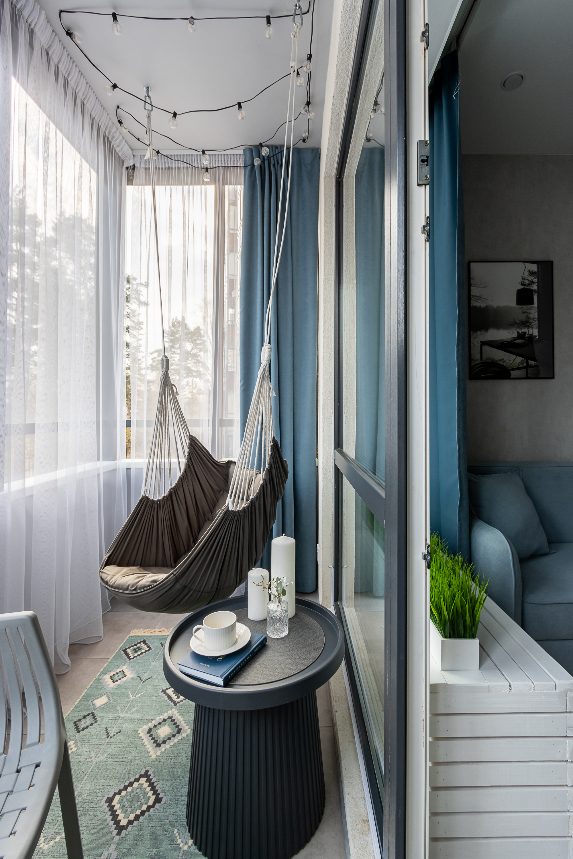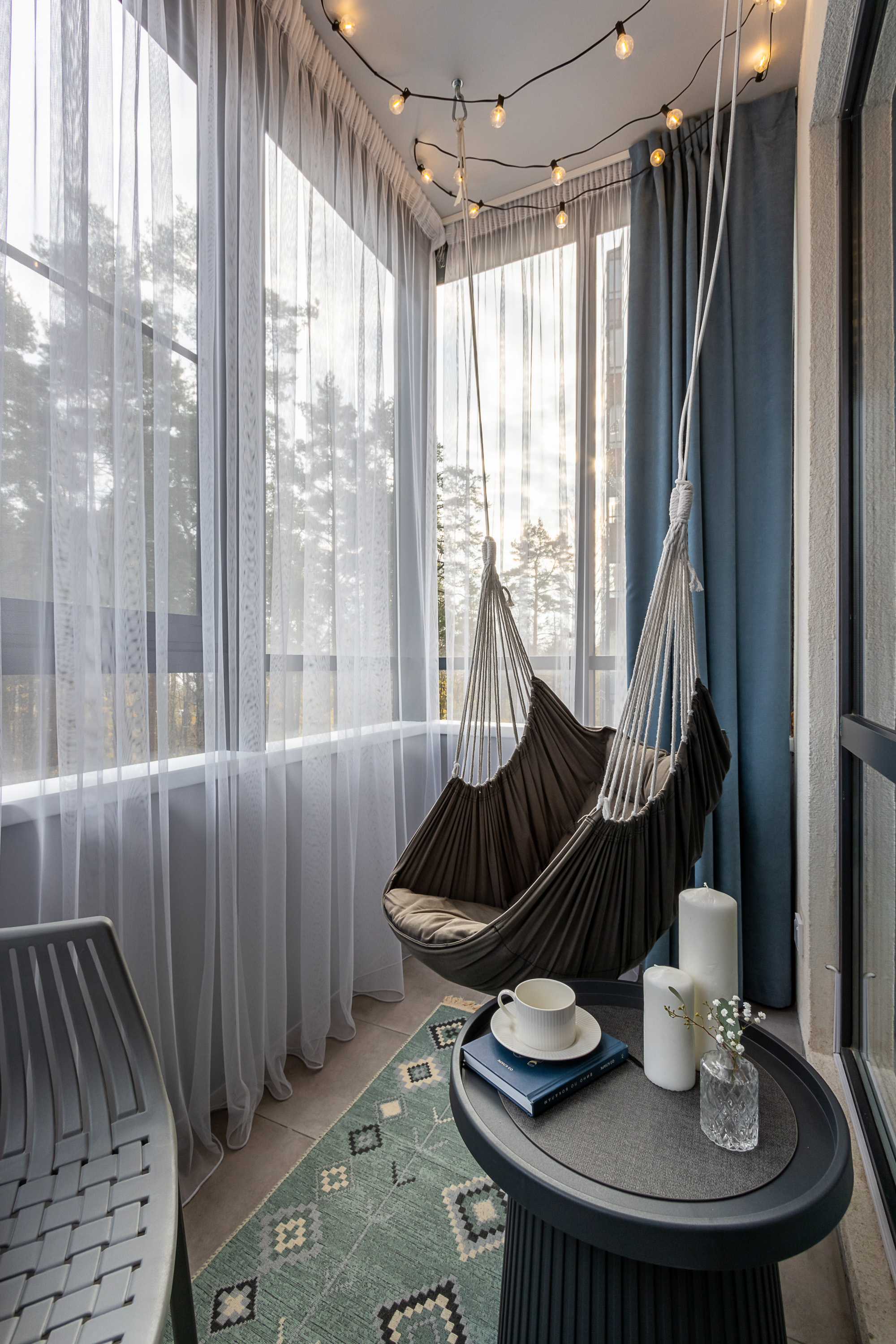 ⚪ Балкон-мечта: подвесная качель и "инстаграмная" зона отдыха с гирляндой и пледами — Ваше место силы с видом на сосновый лес.