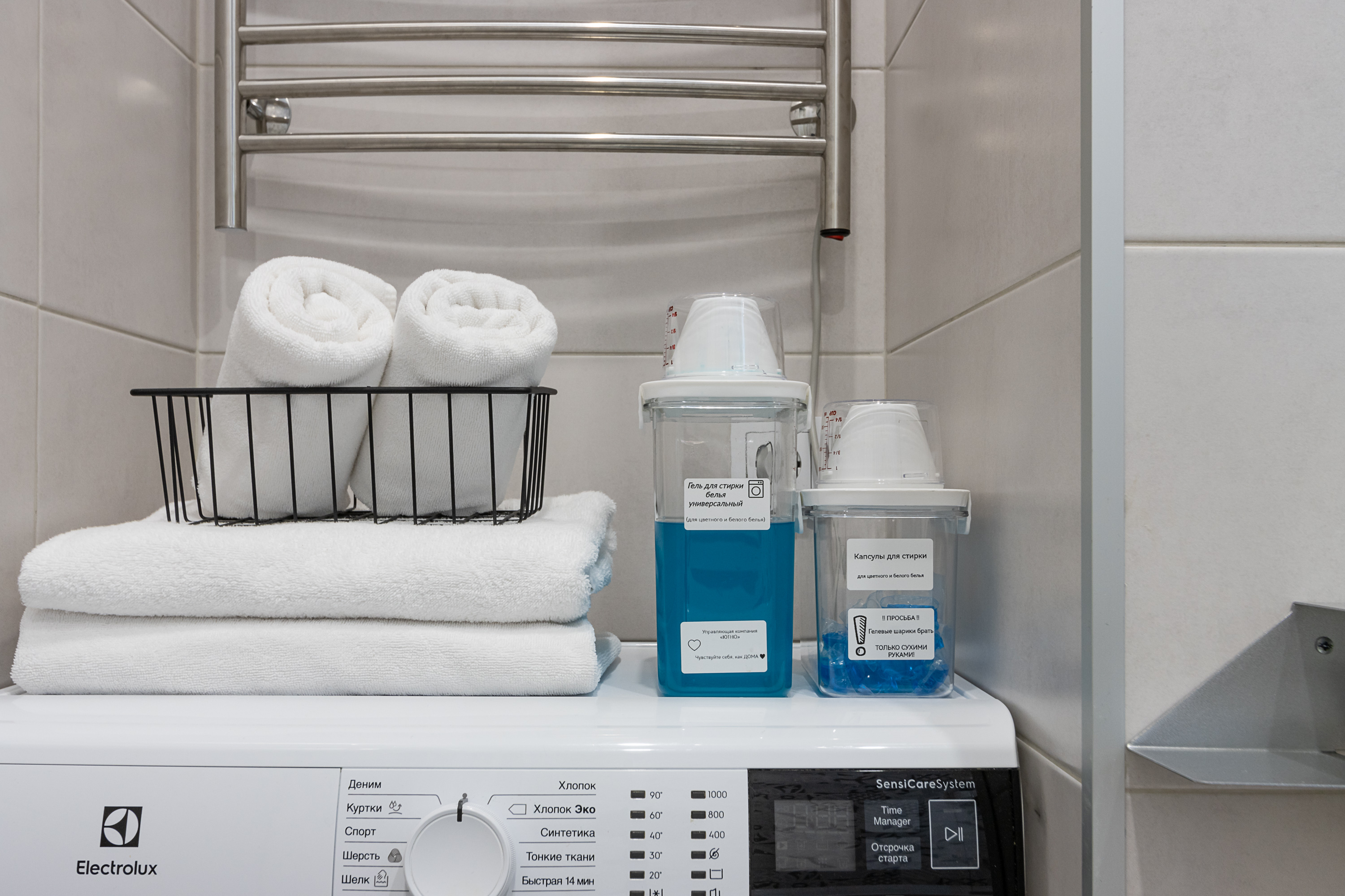 постельное белье и полотенца на указанное кол-во Гостей в бронировании, гигиенические и косметические средства, москитные сетки, шторы блэкаут, стиральная машина, фен-стайлер, паровой утюг с гладильной доской-стремянкой, сушилка для белья, максимальный набор посуды и кухонных приборов, моющие средства, приветственный набор продуктов