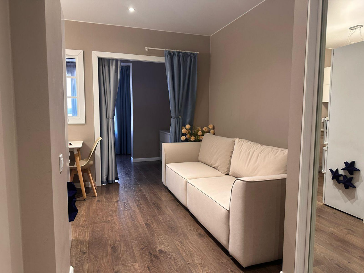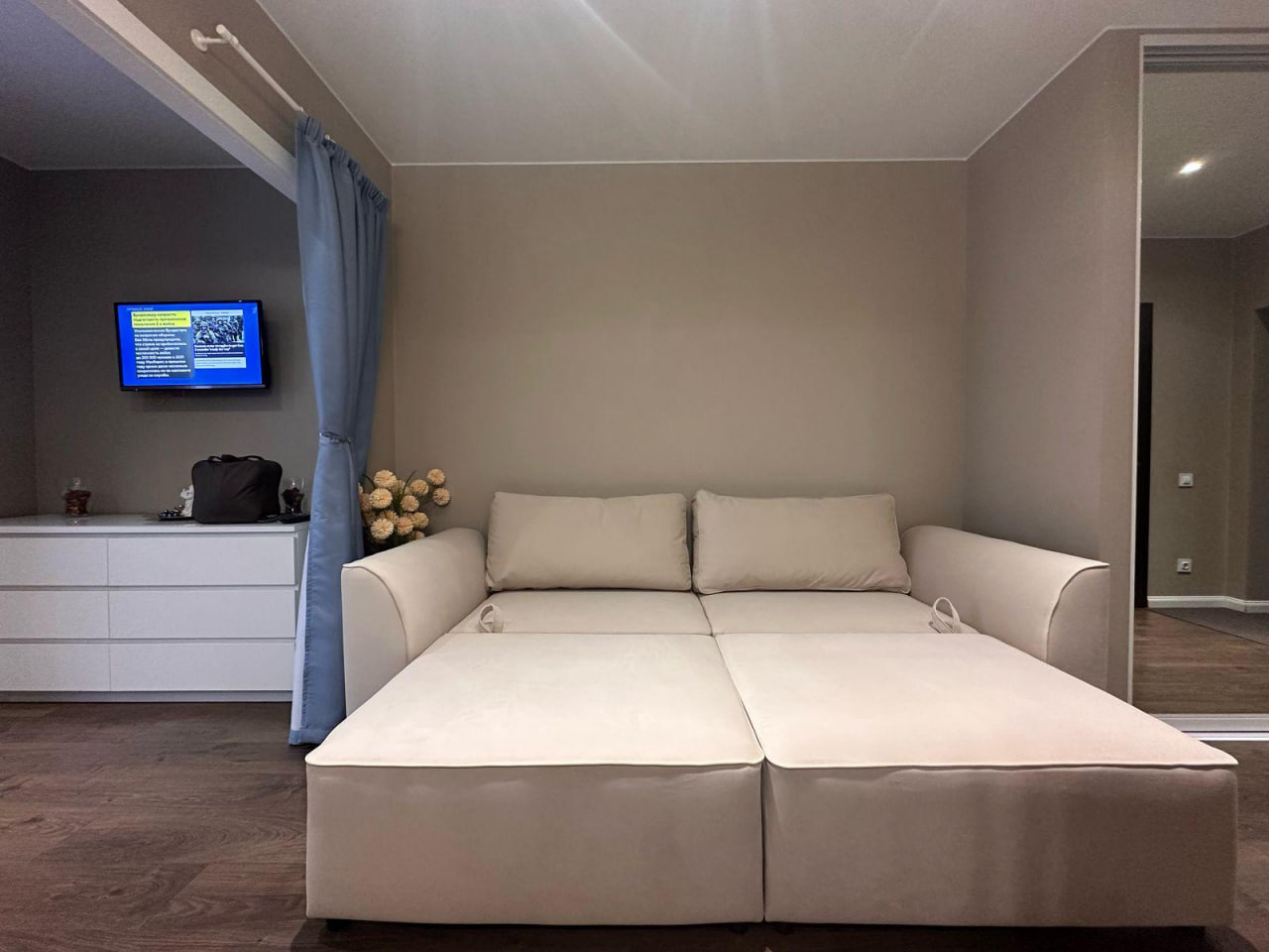 Двуспальная кровать и комфортный диван-кровать в кухне-гостиной