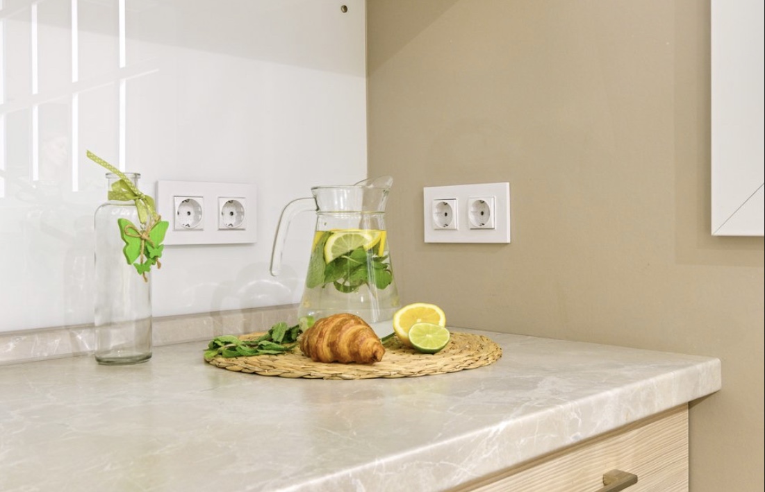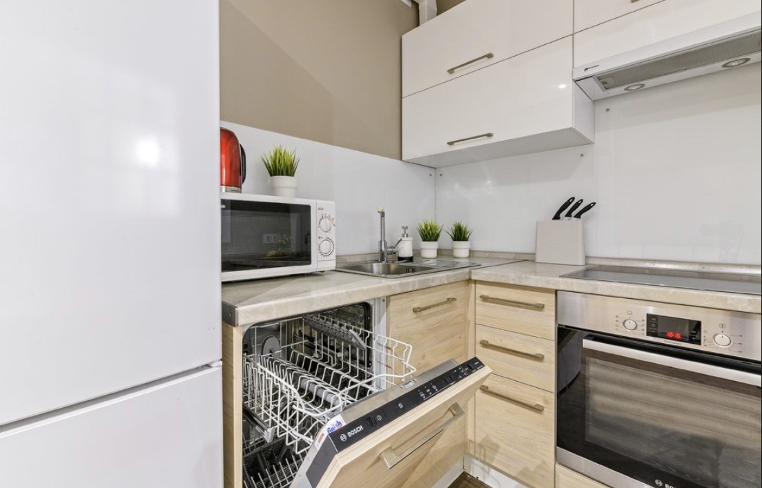 холодильник, электрическая плита, духовка, электрочайник, микроволновая печь, посудомойка, кофемашина 2в1 (капсулы + молотый кофе)